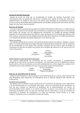 Este documento presenta una explicación detallada de varias razones financieras comúnmente utilizadas para analizar el desempeño financiero de una empresa. Define y calcula razones de liquidez, administración de activos, administración de deudas y rentabilidad. También describe la gráfica de DuPont, la cual muestra la relación entre margen de utilidad, rotación de activos y apalancamiento financiero en la determinación de la rentabilidad sobre los activos y el capital de los accionistas.
