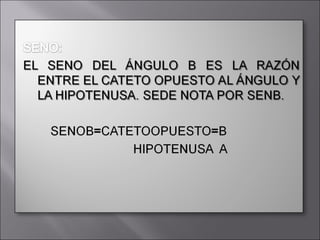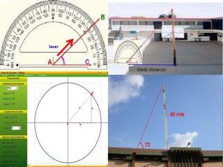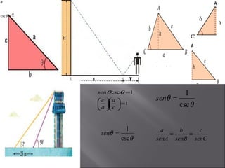Este documento trata sobre las razones trigonométricas en un triángulo rectángulo. Explica que la trigonometría estudia las relaciones entre los lados y ángulos de triángulos. Luego, resuelve varios problemas aplicando las razones trigonométricas para calcular longitudes y ángulos desconocidos.