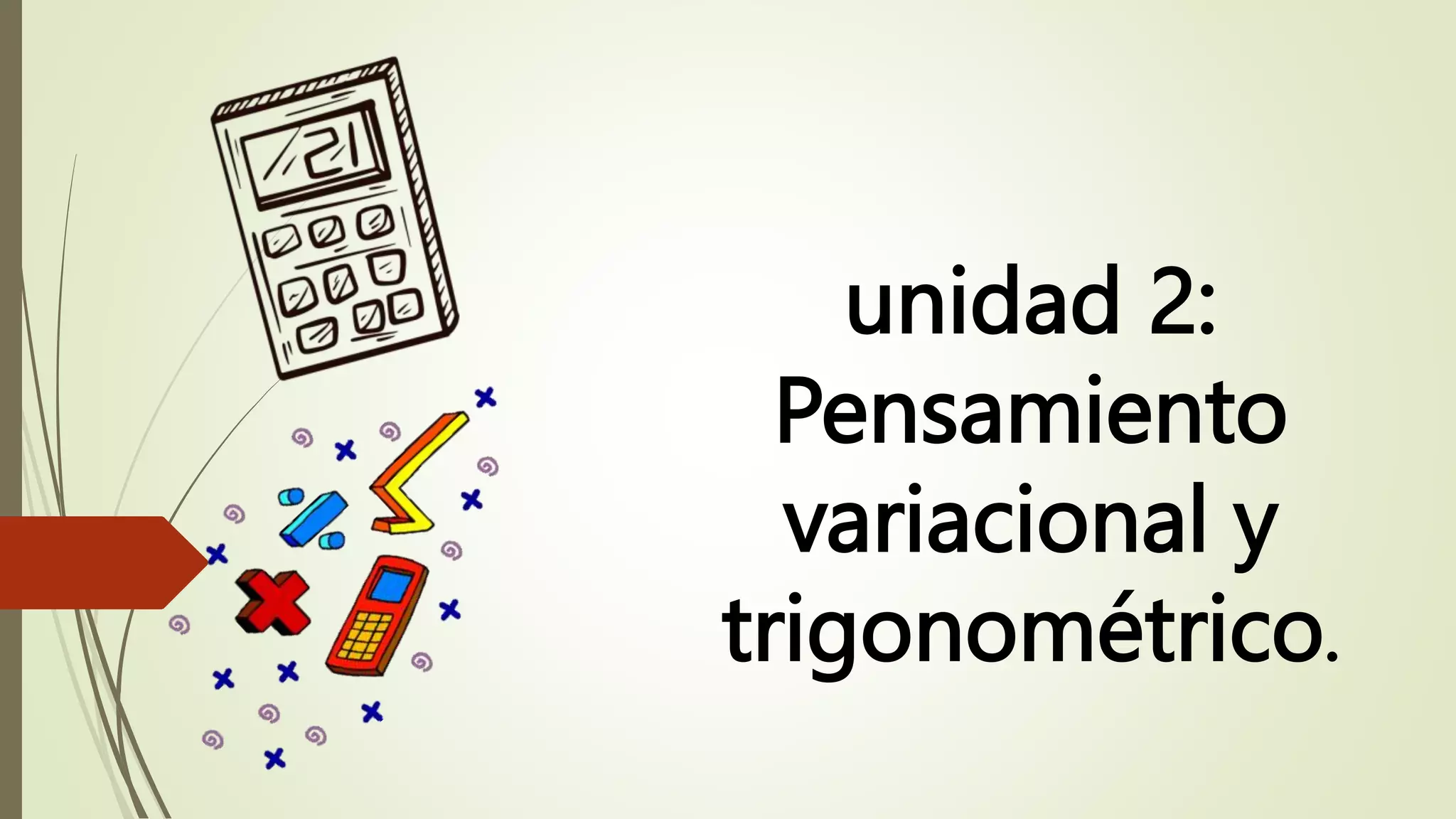 Este documento presenta información sobre la Unidad 2 de pensamiento variacional y trigonométrico. Explica definiciones clave como las funciones trigonométricas, relaciones trigonométricas y clases de razones trigonométricas. También cubre temas como identidades trigonométricas básicas, ejemplos de resolución de problemas trigonométricos y recomendaciones para resolver ecuaciones trigonométricas.