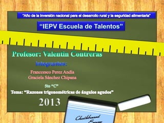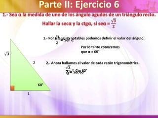 El documento presenta información sobre trigonometría. Explica cómo calcular el valor de un ángulo dado una razón trigonométrica y cómo resolver ecuaciones trigonométricas. También muestra cómo determinar valores desconocidos en triángulos utilizando propiedades trigonométricas.