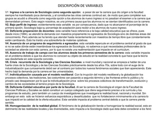 El documento presenta un árbol de problemas de la carrera de Sociología. Los principales problemas son la baja identificación de los estudiantes con la carrera, la deficiente calidad educativa y la falta de inserción laboral de los egresados. Estos problemas se deben a factores como que Sociología se ofrece como segunda opción, la crisis de las ciencias sociales, la falta de incentivos al esfuerzo individual y la homogenización global.