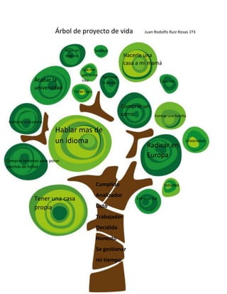 El documento presenta el árbol de proyecto de vida de Juan Rodolfo Ruiz Rosas, el cual incluye objetivos a corto, mediano y largo plazo como terminar la preparatoria, acabar la universidad, comprar un carro, tener hijos, casarse, abrir un negocio y radicar en Europa.