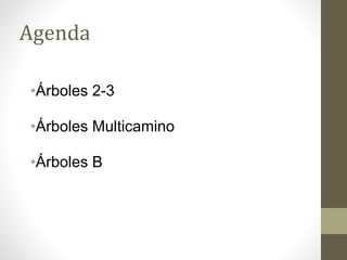 El documento describe varios tipos de árboles de búsqueda, incluyendo árboles 2-3, multicamino y árboles B, con énfasis en sus estructuras, inserciones y eliminaciones. Los árboles 2-3 son balanceados y optimizan el acceso, mientras que los árboles multicamino permiten múltiples hijos por nodo y tienen un rendimiento variable. Los árboles B se presentan como una solución autobalanceada, manteniendo la altura constante y facilitando operaciones eficientes de inserción y eliminación.