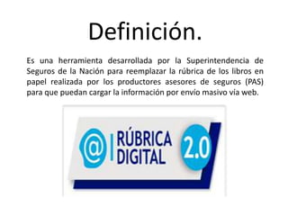 La rúbrica digital es una herramienta desarrollada por la Superintendencia de Seguros de la Nación para que los productores asesores de seguros (PAS) puedan cargar información de forma digital y masiva en lugar de usar libros de papel. La rúbrica digital afecta a personas físicas y jurídicas con matrícula en seguros y tiene ventajas como reducción de costos e impresión y agilización de trámites. Los PAS primero deben adherirse en la AFIP y pagar créditos para cargar datos