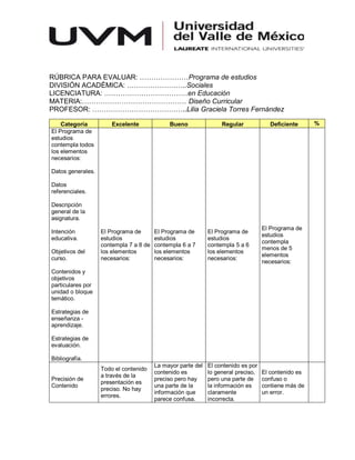 Este documento presenta una rúbrica para evaluar programas de estudios en la licenciatura en Educación. La rúbrica evalúa si el programa de estudios incluye elementos como datos generales, descripción de la asignatura, objetivos, contenidos por unidad temática, estrategias de enseñanza-aprendizaje, estrategias de evaluación y bibliografía. También evalúa la precisión del contenido, la secuencia de la información, la selección de tipo de letra y formato, y la ortografía y gramática.