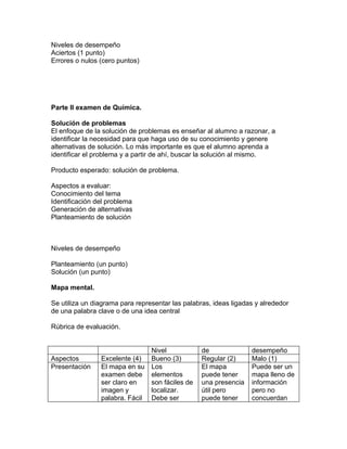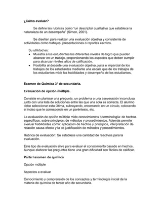 Este documento describe un plan de evaluación para un curso de química de tercer año de secundaria. La evaluación consta de varias partes, incluido un examen que representa el 50% de la calificación, un portafolio que representa el 10% y una evaluación continua que representa el 40% restante. La evaluación continua incluye tareas, proyectos, prácticas de laboratorio y exámenes cortos para evaluar diferentes aspectos del aprendizaje de los estudiantes. El objetivo de este enfoque de evaluación integral es pro