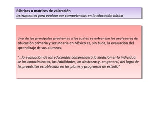 El documento describe las rúbricas o matrices de valoración como instrumentos para evaluar por competencias en la educación básica. Explica que las rúbricas son herramientas que permiten evaluar de manera formal el desempeño de los estudiantes al realizar tareas, midiendo conceptos, procedimientos y actitudes. Además, destaca que las rúbricas son útiles para que la evaluación ayude a mejorar los procesos de enseñanza y aprendizaje.