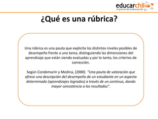 Una rúbrica es una herramienta de evaluación que describe los diferentes niveles de desempeño de una tarea u objetivo de aprendizaje. Puede ser holística, evaluando el trabajo completo, o analítica, evaluando cada componente por separado. Las rúbricas brindan criterios claros para los estudiantes y profesores, promoviendo expectativas de aprendizaje y retroalimentación para mejorar el desempeño.