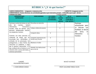 Este documento contiene varias rúbricas de evaluación para estudiantes de tercer grado. Cada rúbrica evalúa un aprendizaje esperado, e indica si el estudiante lo logra de forma autónoma, con apoyo o se le dificulta lograrlo con apoyo. Las rúbricas cubren diferentes áreas como lenguaje escrito, oral, expresión artística y conocimiento del mundo natural.