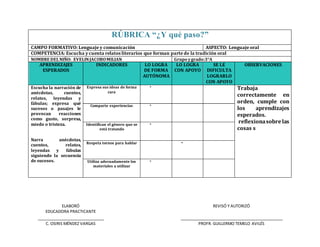 Este documento contiene varias rúbricas de evaluación para estudiantes de tercer grado. Cada rúbrica evalúa un aprendizaje esperado, e indica si el estudiante lo logra de forma autónoma, con apoyo o se le dificulta lograrlo con apoyo. Las rúbricas cubren diferentes áreas como lenguaje escrito, oral, expresión artística y conocimiento del mundo natural.