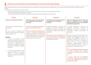 1. El documento presenta una rúbrica de calificación para evaluar la participación y el interés de los estudiantes en las actividades de aprendizaje. 2. La rúbrica considera el nivel de involucramiento de los estudiantes y el docente y 3. busca promover la comprensión del sentido de lo que se aprende.