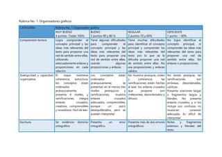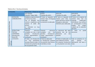La rúbrica No. 1 describe las categorías y criterios para evaluar organizadores gráficos. Se evalúa la comprensión lectora, la dialogicidad y capacidad organizativa, y la escritura. La rúbrica No. 2 evalúa la estructura, intención comunicativa, estructura textual y contenido, y microestructura textual de textos escritos. La rúbrica No. 3 evalúa la estructura, calidad y organización de la información, conclusiones, fotografías y aspectos ortográficos de informes.