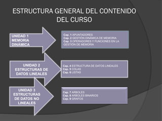 El documento presenta el contenido de un curso sobre estructuras de datos. El curso está dividido en 3 unidades que cubren memoria dinámica, estructuras de datos lineales y no lineales. Cada unidad contiene varios capítulos sobre temas específicos. El curso otorga 3 créditos y la evaluación del 40% se realiza a través de un proyecto final. Incluye 6 prácticas de laboratorio de 2 horas cada una desarrolladas en el centro de estudios asignado. El componente práctico tiene un valor entre 0