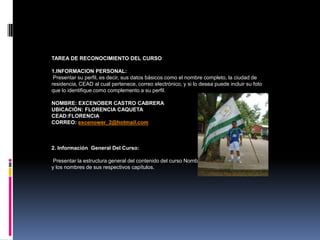 El documento presenta la información sobre el curso de reconocimiento de estructuras de datos. El curso contiene 3 unidades didácticas con sus respectivos capítulos sobre memoria dinámica y estructuras de datos lineales y no lineales. El curso requiere 3 prácticas de laboratorio de 4 horas cada una desarrolladas en el CEAD correspondiente utilizando el compilador C++. El componente práctico representa el 100 puntos de los 300 del 60% de la calificación del curso y será evaluado de forma individual por cada tutor.