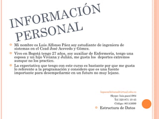 Luis Alfonso Páez es un estudiante de 27 años de ingeniería de sistemas que vive en Bogotá con su esposa e hijo. Le gusta la programación y espera mejorar sus habilidades con este curso de Estructura de Datos en C++ de 3 créditos que se evalúa con un proyecto final.