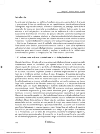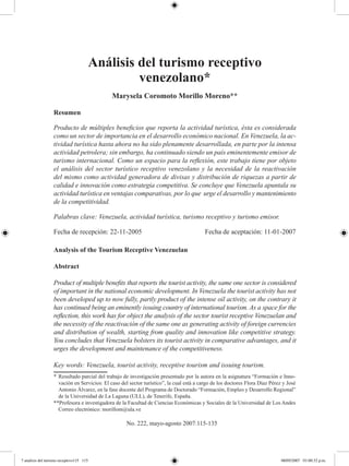 El documento analiza el turismo receptivo en Venezuela. Señala que a pesar de sus atractivos naturales y potencial, el turismo no se ha desarrollado plenamente debido a la dependencia petrolera. En 2005, Venezuela recibió 131,241 visitantes internacionales en el primer trimestre, un aumento del 21.7% respecto al año anterior. Sin embargo, la contribución del turismo al PIB sigue siendo pequeña, representando solo el 2.6% en 2003. Para aprovechar mejor este sector, se requiere enfocarse en la calidad e innovación como e