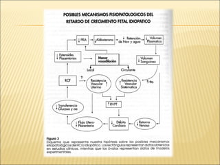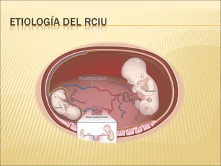El documento describe las características del crecimiento fetal y del retraso del crecimiento intrauterino (RCIU). Explica que el crecimiento fetal ocurre en tres fases y está mediado por la insulina y otros factores. Define el RCIU y enumera factores maternos, fetales y ovulares que pueden causarlo. También describe los dos tipos de RCIU, las características clínicas, los exámenes para diagnosticarlo y las complicaciones asociadas.