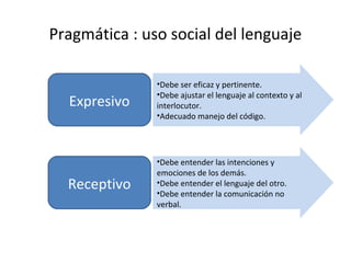 Este documento presenta una introducción a la pragmática y su aplicación en el lenguaje infantil. Resume los conceptos clave de la pragmática como el uso social y adecuado del lenguaje, los actos de habla directos e indirectos, y las habilidades conversacionales que desarrollan los niños. También describe estrategias para la evaluación y entrenamiento del desarrollo pragmático, incluyendo el reconocimiento de emociones, comprensión de creencias, y uso de historias sociales y cuentos.
