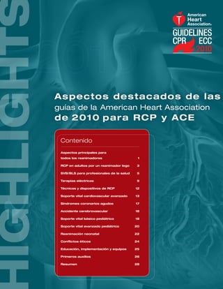 Este documento resume los principales cambios en las guías de la American Heart Association (AHA) de 2010 para reanimación cardiopulmonar (RCP) y atención cardiovascular de emergencia (ACE) en comparación con las guías de 2005. Los cambios incluyen un mayor énfasis en la calidad de las compresiones torácicas, el cambio de la secuencia de pasos de RCP de A-B-C a C-A-B, y una nueva sección sobre cuidados posparo cardíaco. El objetivo es mejorar la evolución del paro cardíaco
