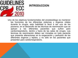 Este documento trata sobre la reanimación cardiopulmonar (RCP). Explica que la RCP consiste en un conjunto de maniobras destinadas a asegurar la oxigenación de los órganos vitales cuando la circulación sanguínea se detiene repentinamente. Describe los pasos básicos de la RCP, incluyendo abrir la vía aérea, realizar 30 compresiones torácicas seguidas de 2 ventilaciones. También cubre temas como la frecuencia y profundidad adecuadas de las compresiones torácic