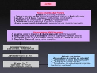 Este documento resume los objetivos y procedimientos básicos de la reanimación cardiopulmonar (RCP), incluida la definición de paro cardiorrespiratorio, las causas más comunes, y los pasos clave para el manejo como la activación del servicio de emergencia médica, RCP básica, desfibrilación y apoyo vital avanzado. Explica que la sobrevida depende de factores como el lugar del paro, la condición cardiovascular previa y el tiempo de inicio de las maniobras, siendo mayor si se inician en