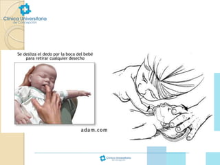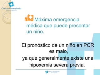 Este documento proporciona información sobre reanimación cardiopulmonar básica pediátrica. Explica que el paro cardiorrespiratorio en niños generalmente tiene un mal pronóstico debido a hipoxemia previa y que las causas difieren de los adultos, incluyendo obstrucciones de vía aérea, traumatismos, intoxicaciones y enfermedades. Detalla los pasos de reanimación CAB (circulación, vía aérea y respiración), incluyendo técnicas de masaje cardíaco externo y vent
