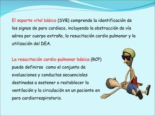 El documento proporciona información sobre el soporte vital básico para niños que experimentan una parada cardiorrespiratoria. Describe las etapas de la reanimación cardiopulmonar pediátrica, incluida la apertura de las vías respiratorias, la ventilación, el masaje cardíaco y la relación de compresiones y ventilaciones, así como las consideraciones específicas para lactantes y niños de diferentes edades. También cubre las causas comunes de muerte en niños y la importancia de iniciar la reanimación de inmedi