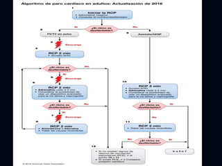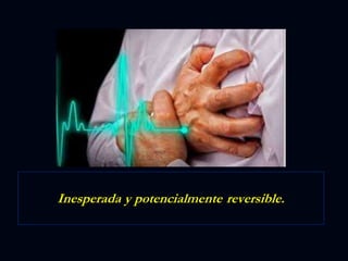 Este documento proporciona información sobre la reanimación cardiopulmonar (RCP). Explica que la RCP consiste en un conjunto de maniobras para reemplazar la función cardíaca y respiratoria de una persona en paro cardiorrespiratorio con el objetivo de recuperar sus funciones cerebrales. Describe los pasos básicos de la RCP, incluidas 30 compresiones torácicas seguidas de 2 ventilaciones, y la importancia de iniciar las compresiones lo antes posible. También cubre aspectos de la RCP avanzada