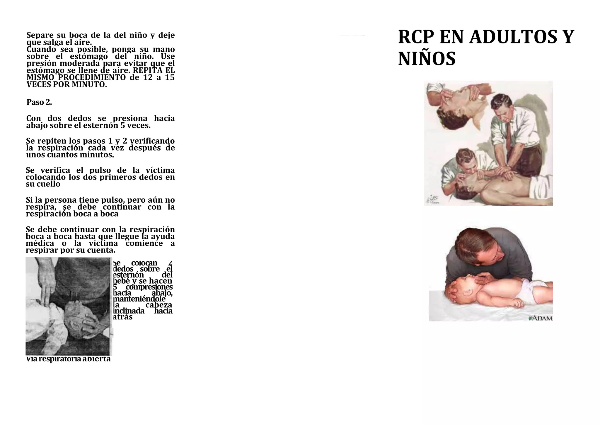 Este documento proporciona instrucciones sobre cómo realizar RCP (reanimación cardiopulmonar) en adultos, niños y bebés. Explica los pasos para verificar la conciencia y respiración de la víctima, abrir las vías respiratorias, realizar respiración boca a boca y compresiones torácicas, y continuar los procedimientos hasta que llegue la ayuda médica o la víctima comience a respirar por sí misma.