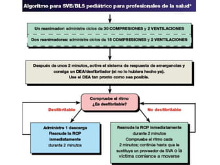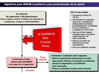 2) Se describe el algoritmo básico de RCP pediátrico, el cual enfatiza realizar compresiones torácicas de manera continua antes de evaluar la vía aérea y ventilación.