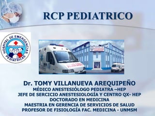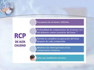 Este documento presenta información sobre reanimación cardiopulmonar pediátrica. Detalla las principales causas de muerte en niños, los algoritmos para el soporte básico y avanzado de vida en pediatría, las guías de 2010 para RCP, y los fármacos utilizados como adrenalina, lidocaína, amiodarona y vasopresina. El documento provee instrucciones detalladas sobre las técnicas y procedimientos de RCP pediátrica.