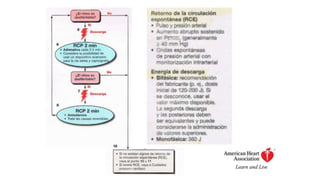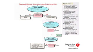 Este documento describe los procedimientos de reanimación cardiopulmonar (RCP) y el soporte vital básico. Explica que la RCP incluye el reconocimiento temprano, la activación del sistema de emergencias, las compresiones torácicas, la ventilación y la desfibrilación. Se enfatiza la importancia de iniciar las compresiones torácicas de inmediato y cambiar los proveedores cada dos minutos para maximizar la probabilidad de supervivencia. También describe los diferentes ritmos cardíacos que pueden ocurrir durante un paro