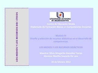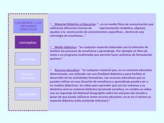 Este documento describe los medios y recursos didácticos, incluyendo su definición, componentes, funciones y tipos. Explica que los medios didácticos son materiales diseñados para facilitar el aprendizaje, mientras que los recursos educativos pueden o no ser medios didácticos. También describe cómo los medios didácticos pueden presentar información, organizarla y ayudar a relacionarla para desarrollar habilidades. Finalmente, discute la evaluación objetiva y contextual de los medios didácticos.