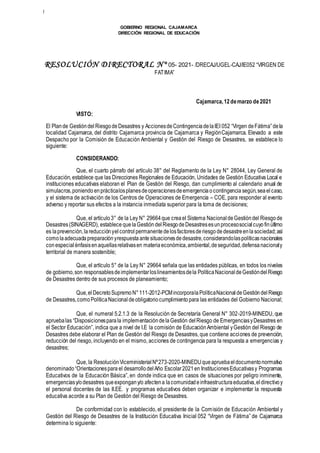 Este documento aprueba el Plan de Gestión del Riesgo de Desastres y Acciones de Contingencia de la Institución Educativa Inicial 052 "Virgen de Fátima" en Cajamarca para el periodo 2021-2022. La resolución cita varias leyes y resoluciones que establecen la necesidad de que las instituciones educativas elaboren planes de riesgos y respuestas a desastres. Se aprueba el plan presentado y se remite una copia a la Unidad de Gestión Educativa Local de Cajamarca.