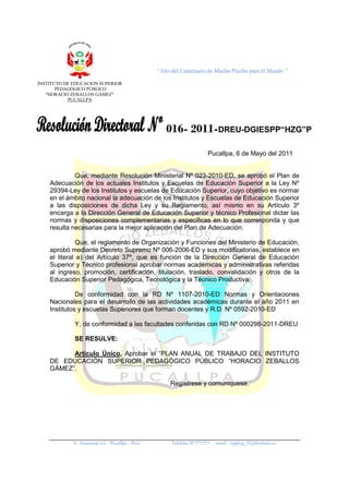 Este documento aprueba el "Plan Anual de Trabajo del Instituto de Educación Superior Pedagógico Público 'Horacio Zeballos Gámez'" para el año 2011. Se refiere a la adecuación de los institutos de educación superior a la Ley No 29394 y su reglamento, y otorga la aprobación para el plan anual de trabajo del instituto mencionado de acuerdo con las normas y orientaciones nacionales para el desarrollo de actividades académicas durante ese año.