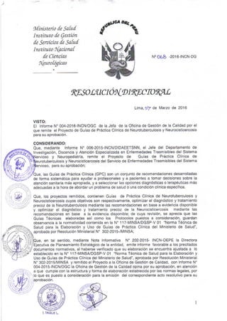 Este documento aprueba las guías de práctica clínica de neurotuberculosis y neurocisticercosis del Instituto Nacional de Ciencias Neurológicas del Perú. Las guías tienen como objetivo optimizar el diagnóstico y tratamiento temprano de estas enfermedades a través de recomendaciones basadas en evidencia. Fueron aprobadas luego de verificar que su elaboración cumple con la normativa nacional para la creación de guías clínicas.