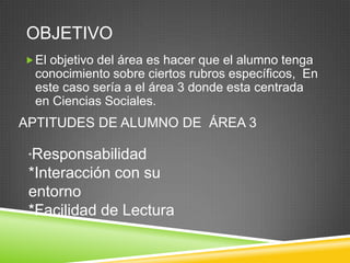 El documento proporciona información sobre el área 3 de ciencias sociales en la Escuela Nacional Preparatoria Número 9 "Pedro de Alba". Explica que el objetivo del área es que los estudiantes adquieran conocimientos sobre ciertos temas de ciencias sociales. Además, detalla las materias del tronco común y del área, así como las opciones técnicas y las carreras a las que pueden acceder los estudiantes después de cursar el área 3.