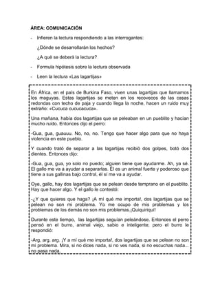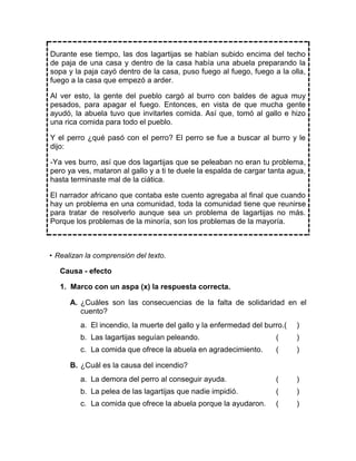 El cuento trata sobre un perro que intenta detener una pelea entre dos lagartijas en una aldea. Ninguno de los otros animales le ayuda, lo que resulta en un incendio. Esto demuestra que los problemas de la minoría afectan a toda la comunidad si no se abordan de manera solidaria.