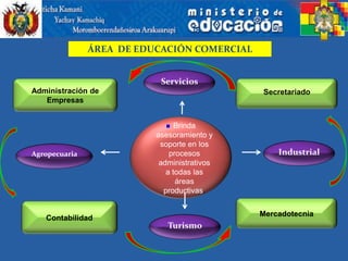 El documento presenta el área de educación comercial del nivel secundario comunitario productivo en Bolivia. Describe los objetivos, contenidos y enfoques del área, los cuales buscan fortalecer las potencialidades productivas regionales mediante el estudio de técnicas de mercadeo social, gestión administrativa, contabilidad y asistencia comercial, desarrollando procesos de intercambio que contribuyan a la economía sociocomunitaria.