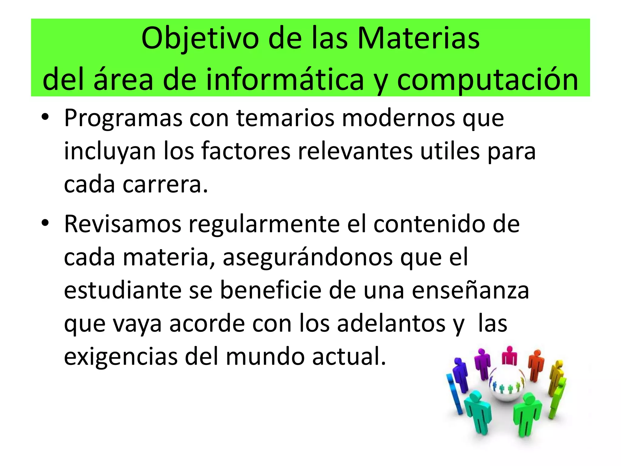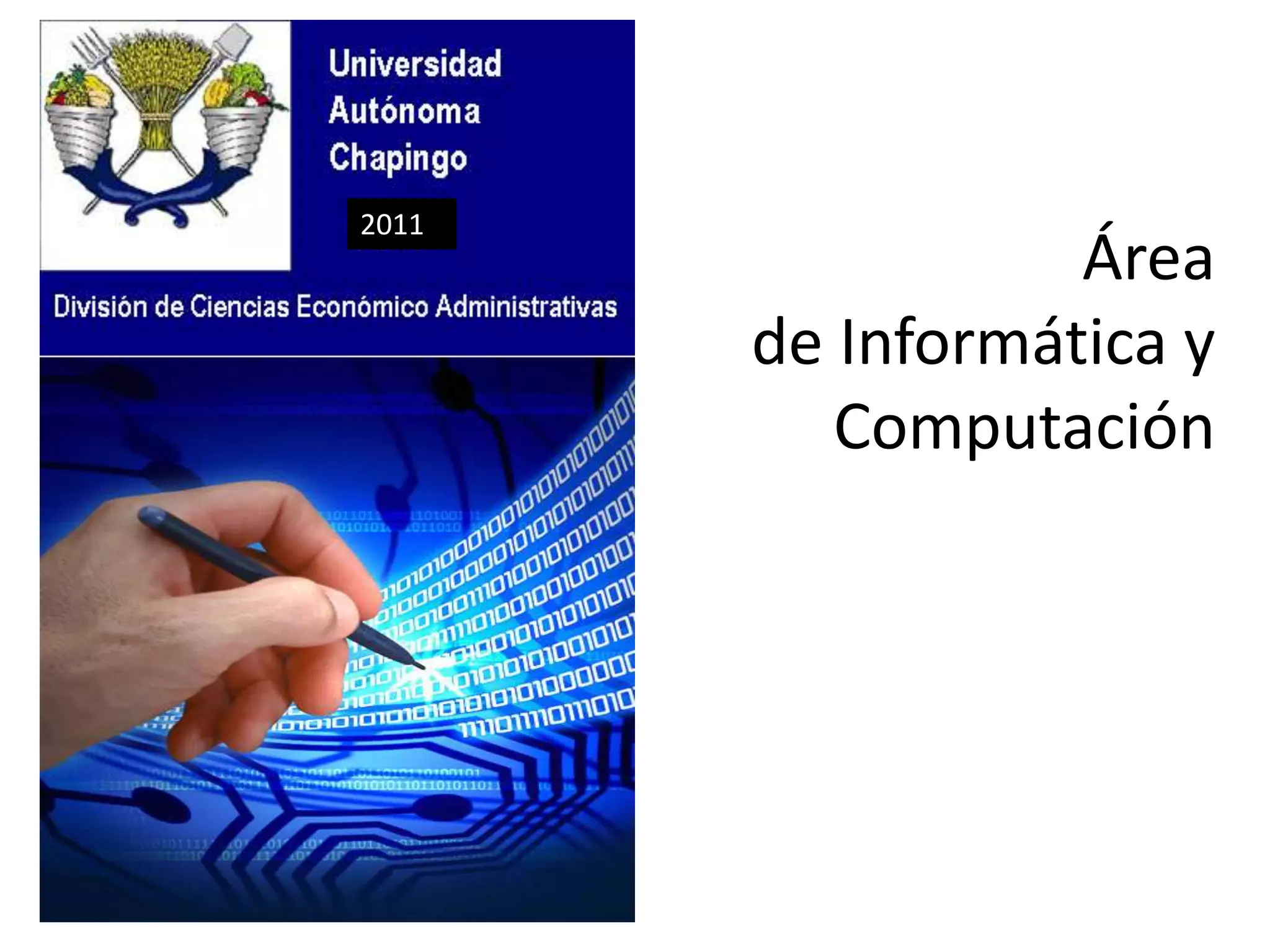 El documento presenta la estructura curricular y los objetivos del área de Informática y Computación de una universidad. Describe las materias que se imparten como hoja de cálculo, bases de datos, programación, diseño web y edición de video. Incluye los temarios de Excel, Access, programación visual basic y R con énfasis en administración. El objetivo es enseñar con contenidos actualizados y software relevante para las carreras.