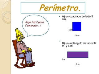 El documento presenta una serie de problemas matemáticos relacionados con el cálculo de perímetros y áreas de diferentes figuras geométricas como cuadrados, rectángulos, rombos y circunferencias. Se piden calcular perímetros, áreas, lados y diagonales de estas figuras. El documento busca ejercitar las habilidades matemáticas del lector resolviendo estos problemas.