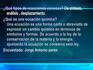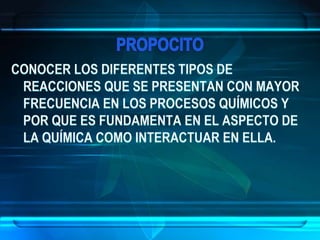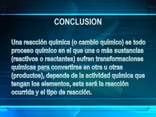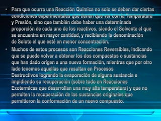 El documento aborda las reacciones químicas, explicando su naturaleza, clasificación y ecuaciones químicas. Detalla el concepto de reactivos y productos, así como factores que influyen en la velocidad de reacción y el intercambio de energía. También se discuten tipos de reacciones y principios como la conservación de la masa en los cambios químicos.