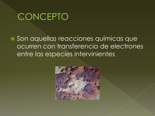 Este documento trata sobre las reacciones de óxido-reducción y los estados de oxidación. Explica que estas reacciones implican la transferencia de electrones entre especies químicas y que los estados de oxidación permiten determinar qué ocurre con los electrones asignando cargas a los átomos. También presenta reglas para asignar estados de oxidación y resuelve ejemplos aplicando estas reglas.