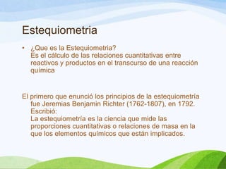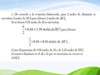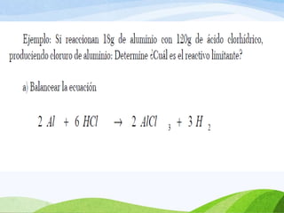 Este documento trata sobre conceptos básicos de estequiometría como reactivo limitante, masa atómica, masa molecular, mol, reacciones químicas, leyes de conservación de la masa y proporciones definidas. Incluye ejemplos de cálculos para determinar el reactivo limitante y el reactivo en exceso en reacciones químicas.