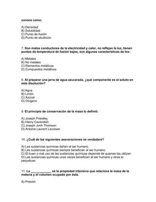 El documento contiene 15 preguntas de opción múltiple sobre conceptos químicos como cantidades, elementos conductores de electricidad, métodos de separación, enlaces iónicos y covalentes, densidad, soluto, principio de conservación de masa, uso de sustancias químicas y cambios químicos.