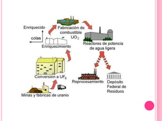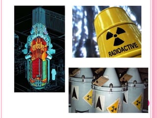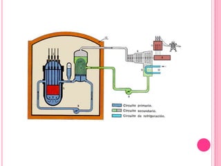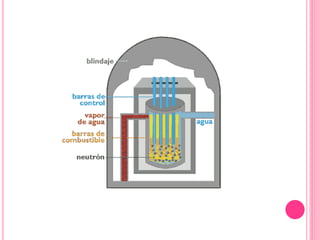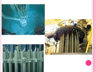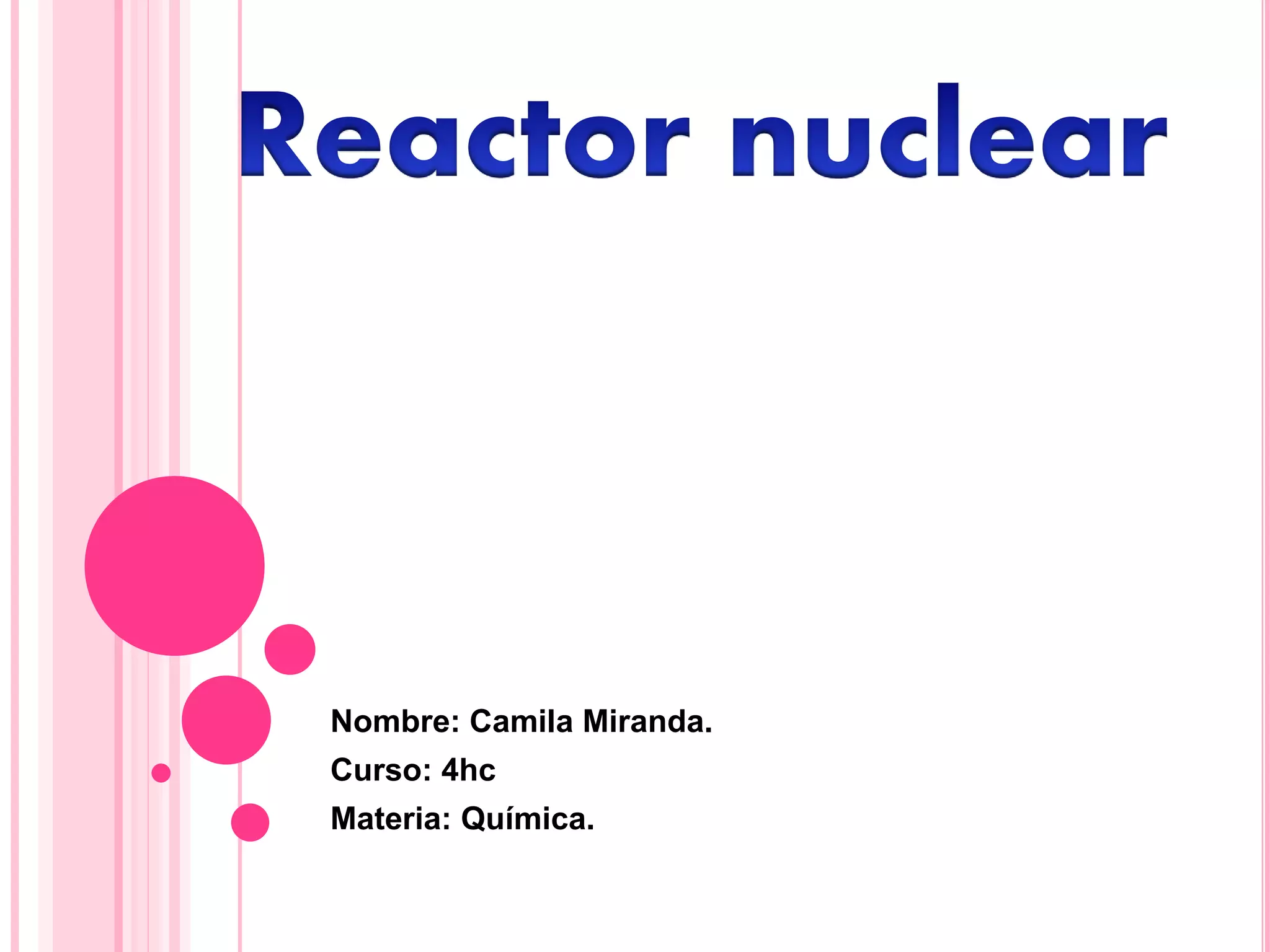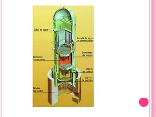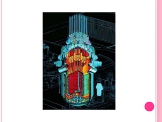 Un reactor nuclear es una instalación que inicia y controla reacciones nucleares de fisión para generar energía, compuesta por combustible, refrigerante, elementos de control y moderador. Los tipos de reactores incluyen térmicos, rápidos y diversos diseños según combustible y refrigerante, cada uno con características específicas como el uso de agua o grafito como moderador. Además, se utilizan para generar electricidad y en aplicaciones de investigación, produciendo grandes cantidades de energía a través de la fisión nuclear.