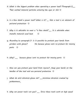 Este documento habla sobre los elementos de protección personal (EPP) recomendados para el uso seguro de herramientas eléctricas portátiles. Explica que las herramientas eléctricas presentan mayores riesgos que las manuales debido a su alta velocidad. Recomienda el uso de gafas de seguridad u otros protectores oculares, así como protectores auditivos y respiradores de polvo. También sugiere el uso de guantes, calzado de seguridad y ropa adecuada. Cada tipo de herramienta