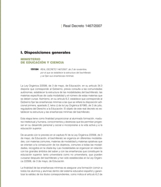 Este documento establece la estructura y las enseñanzas mínimas del bachillerato en España de acuerdo con la Ley Orgánica de Educación. Define el bachillerato como una etapa de dos años después de la educación secundaria obligatoria que prepara a los estudiantes para la educación superior o la incorporación a la vida laboral. Establece las diferentes modalidades de bachillerato, los objetivos comunes, las materias y los requisitos para el acceso, promoción y titulación.