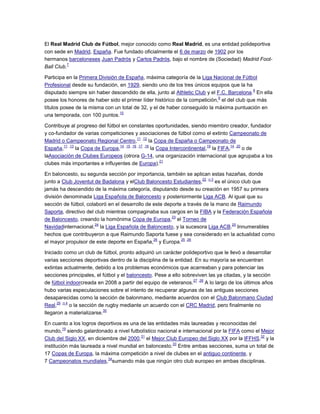 El Real Madrid es un club polideportivo con sede en Madrid, España. Fue fundado en 1902 como club de fútbol y ha ganado numerosos títulos nacionales e internacionales en fútbol y baloncesto. Es uno de los clubes más exitosos y populares del mundo, con más de 93,000 socios y seguidores en todo el mundo.