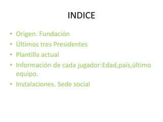 El documento resume la historia y la información actual del Real Madrid CF, incluyendo su fundación en 1902, los últimos tres presidentes (Vicente Boluda, Ramón Calderón y Florentino Pérez) y detalles sobre la plantilla actual y sus instalaciones como el Estadio Santiago Bernabéu.